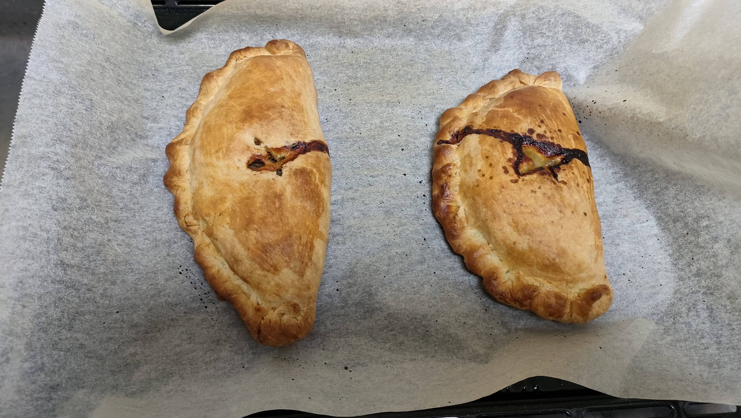 1か所目をカットしたら右に倒し、2か所目をカットしたら左に倒しと、交互にカットしていく。 - 250℃に予熱したオーブンを230℃に下げ18分焼いたら完成。